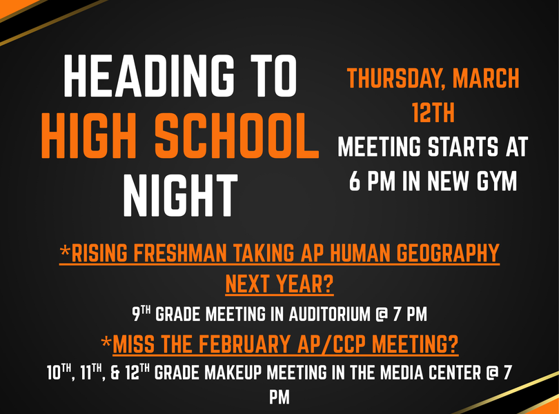 Heading to High School Night & AP/CCP Night 6 PM in New Gym- 9th Grade Information Meeting7 PM in Auditorium- 9th Grade AP Information Meeting7 PM in Media Center- 10th, 11th, & 12th Grade AP/CCP Information Meeting (Makeup night for those unable to attend in February)
